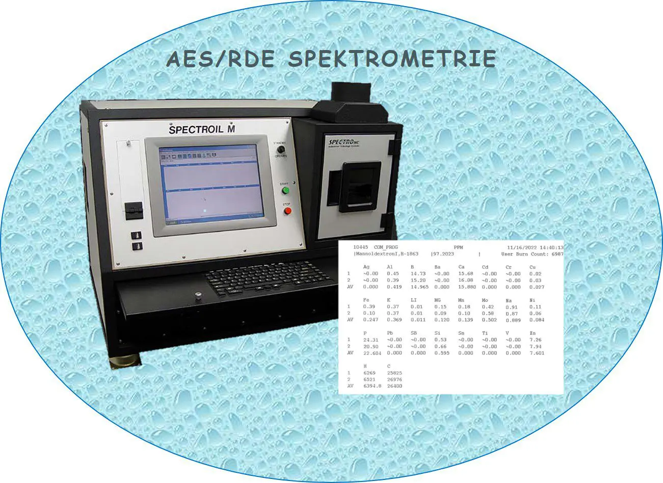 Na přístroji SPECTROIL M jsme schopni z malého množství vzorku stanovit koncentraci otěrových kovů, nečistot i aditiv v mazivech. Standardní konfigurace tohoto přístroje umožňuje stanovovat obsah Ag, Al, B, Ba, Ca, Cd, Cr, Cu, Fe, K, Li, Mg, Mn, Mo, Na, Ni, P Pb, Sb, Si, Sn, Ti, V, Zn ve vzorcích různých druhů olejů.